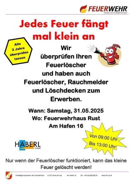 Am Samstag, den 31.05.2025, findet im Feuerwehrhaus Rust die alljährliche Feuerlöscher Überprüfung statt.