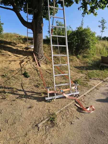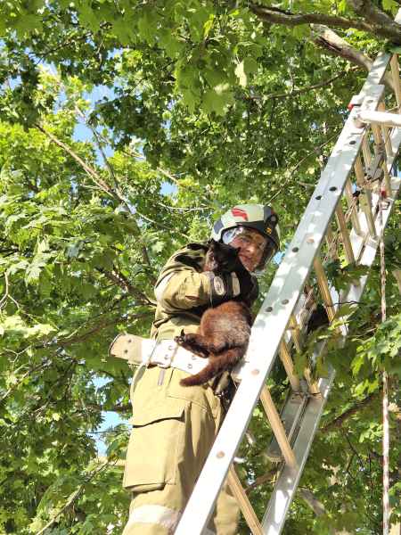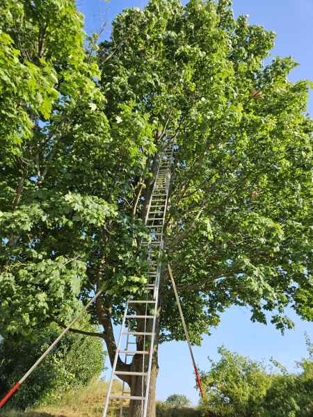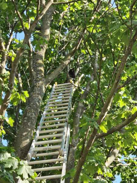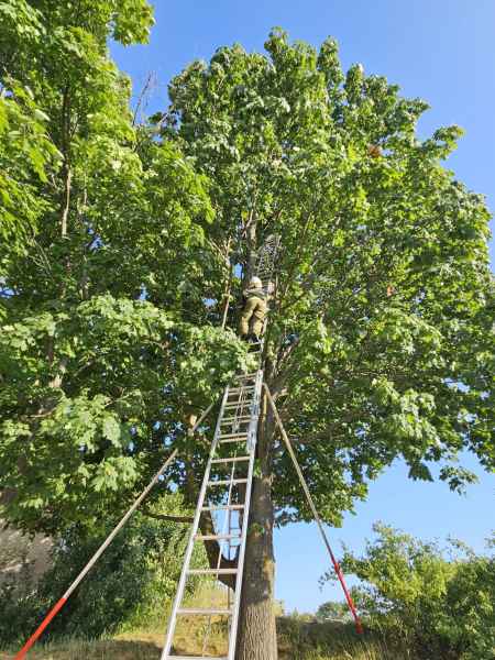 Seit den Vormittagsstunden befand sich eine Katze in etwa 13 Metern Höhe auf einem Baum und konnte diesen aus eigener Kraft nicht mehr verlassen.
