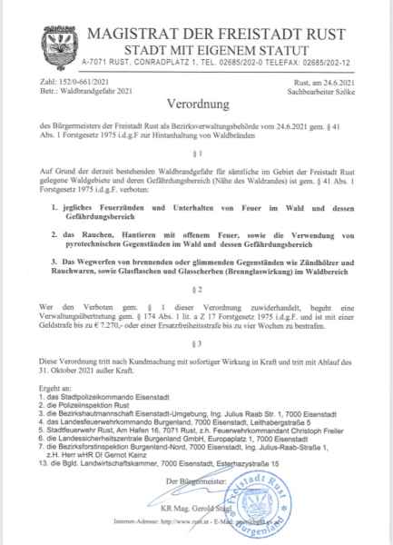 So wie im gesamten Burgenland gilt auch für das Gebiet um die Freistadt Rust die Verordnung für Waldbrandgefahr seit 24.06.2021.