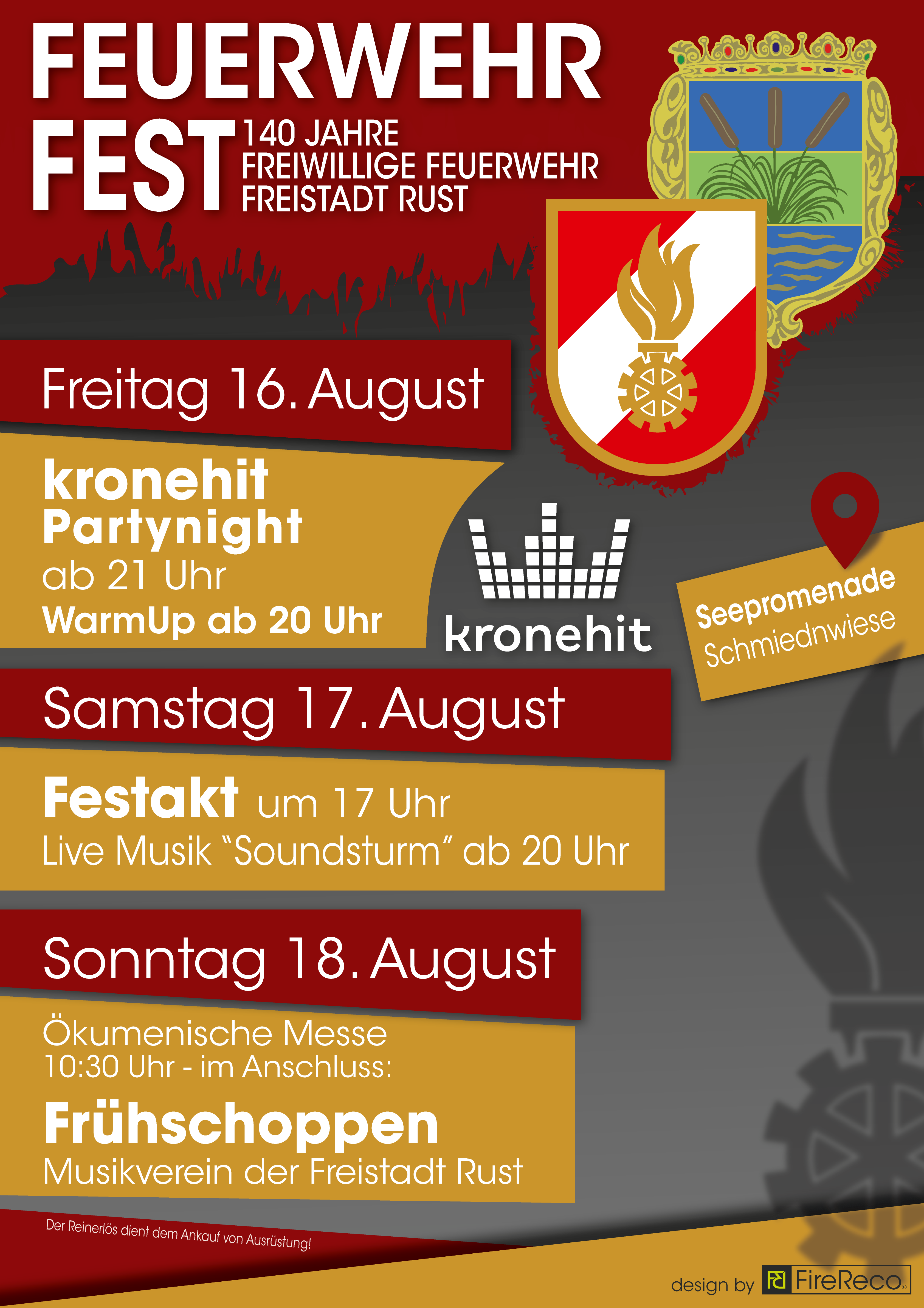 Die Freiwillige Feuerwehr der Freistadt Rust ladet sie recht Herzlich zum diesjährigen Jubiläums Feuerwehrfest von 16.8. - 18.08.2024 ein. 140 Jahre Feuerwehrgeschichte in der Freistadt Rust auf das wollen wir zurück blicken und mit Ihnen feiern.