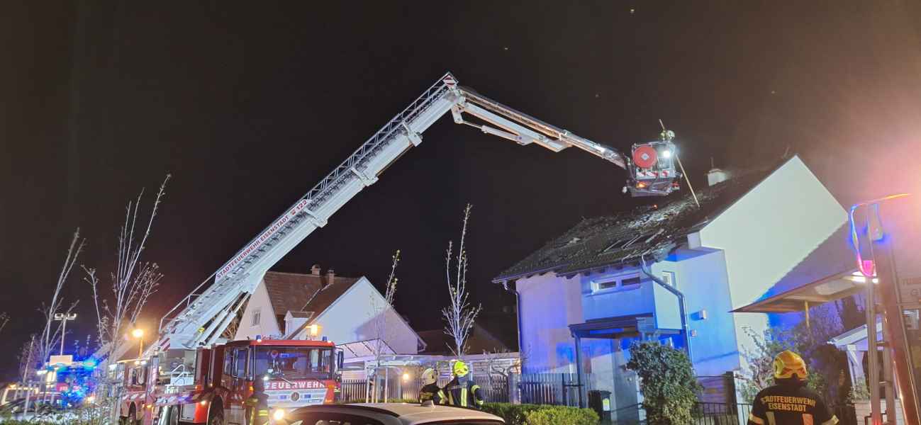 Kurze Zeit später traf die Feuerwehr Freiwillige Stadtfeuerwehr Eisenstadt mit der Teleskopmastbühne ein. Diese wurde vor dem Brandobjekt in Stellung gebracht, um Löschmaßnahmen von oben gezielt durchführen zu können. Die Wasserversorgung wurde aus den umliegenden 3 Hydranten sichergestellt.