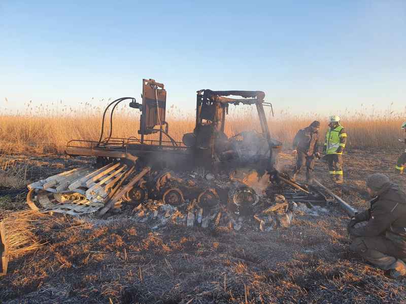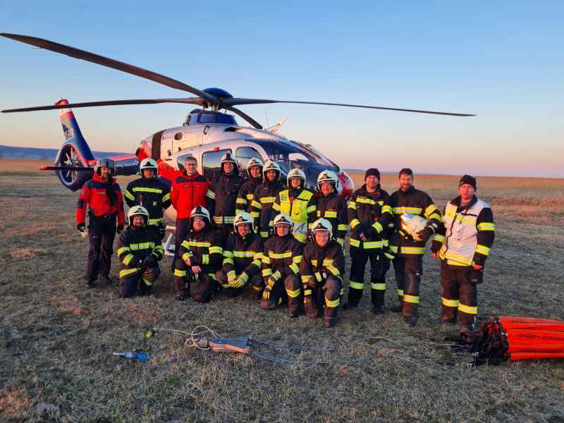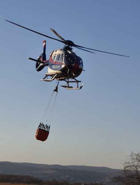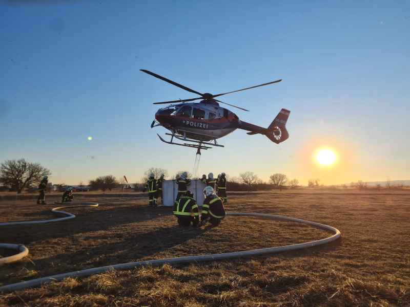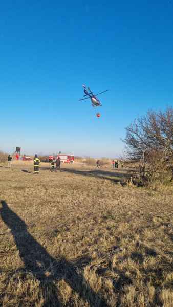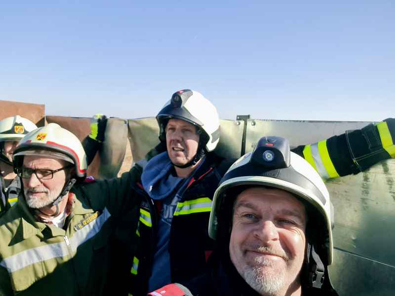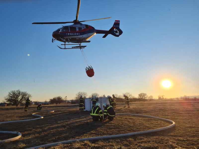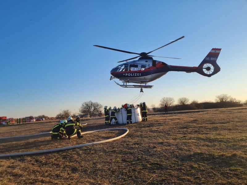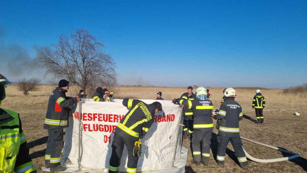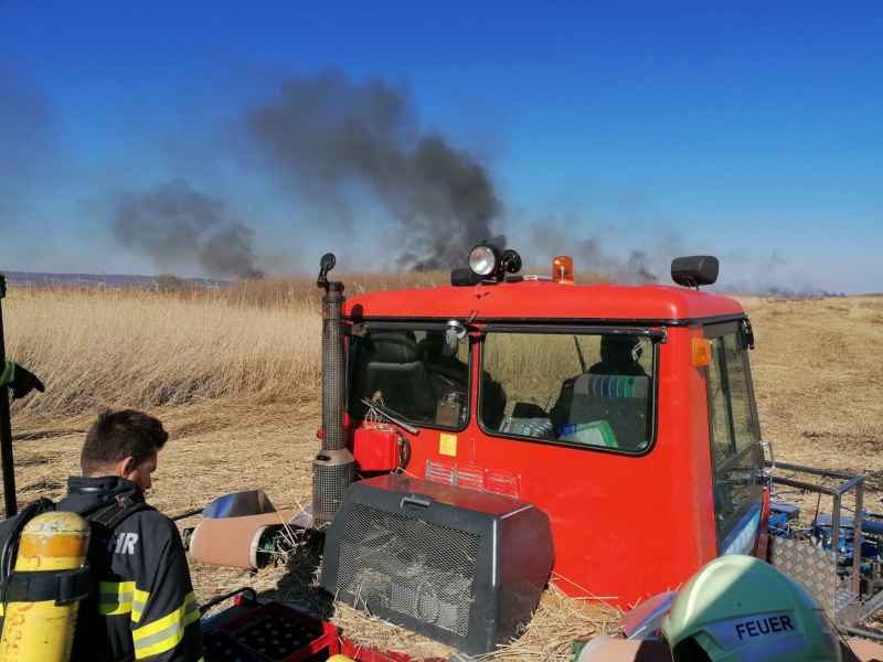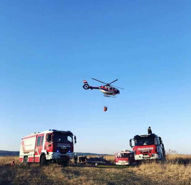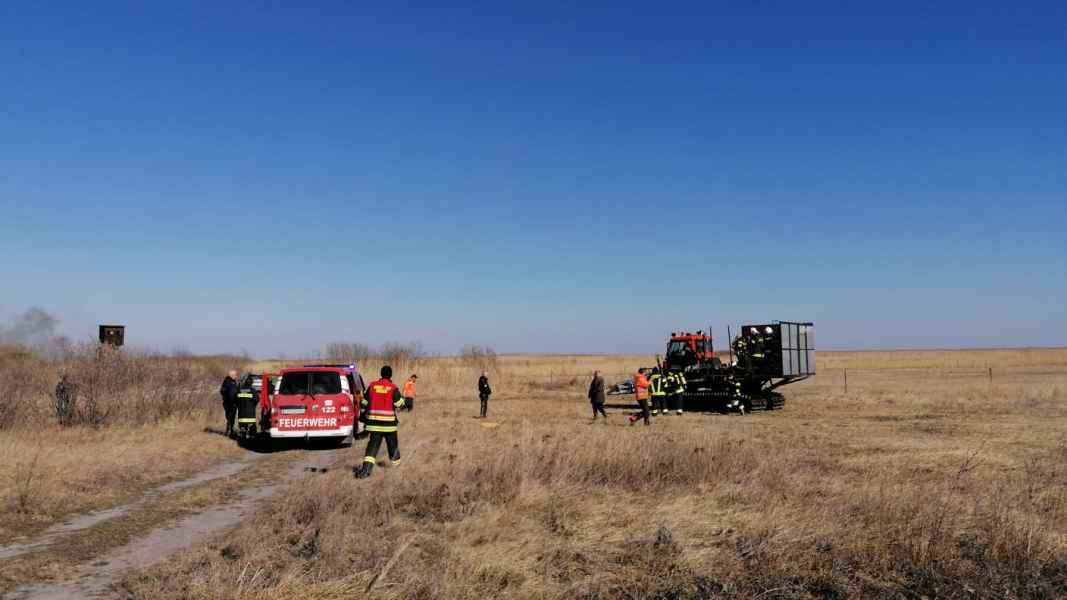 Auf der Anfahrt wurden wir informiert, dass sich der Brand bereits im Schilfgürtel ausbreitet und mehrere Hektar Schilf betroffen sind. Zusammen mit der Feuerwehr Oggau wurden erste Löschmaßnahmen gesetzt, die sich als sehr schwierig erwiesen, da der Brandbereich sehr schwer zu erreichen war. Mit Hilfe einer weiteren Schilferntemaschine konnte die Mannschaft und erste Löschmittel zum Brandherd gebracht werden. Die in Brand geratene Erntemaschine konnte erfolgreich mit mehreren Feuerlöschern gelöscht werden. Das Löschen des Schilfs war in Folge mehr als schwierig. Die eingesetzten Kräfte versuchten die Ausbreitung mittels Feuerpatschen einzudämmen, doch durch den mäßigen Wind fachten immer wieder Glutnester auf und verbreiteten das Feuer. Mit der eingesetzten Drohne konnte die Lage und Ausbreitung genau beobachtet werden. Kurzerhand wurde entschieden, dass es nur Sinn macht den Brand aus der Luft zu bekämpfen. Über die Einsatzleitung wurden alle Maßnahmen für eine Anforderung gesetzt und ein Hubschrauber, sowie der Flugdienst Nord nachalarmiert. Zirka 60 min. nach Anforderung des Hubschraubers und des Flugdienstes war alles bereitgestellt und vorbereitet für die Löschmaßnahmen aus der Luft.