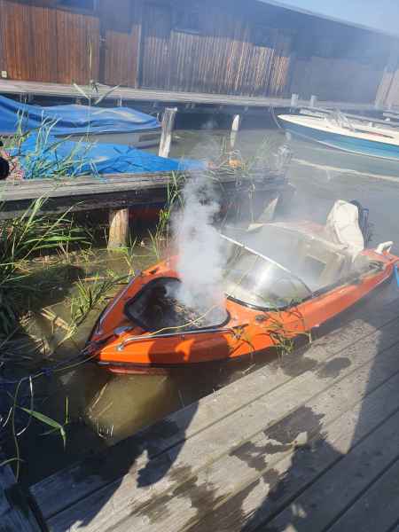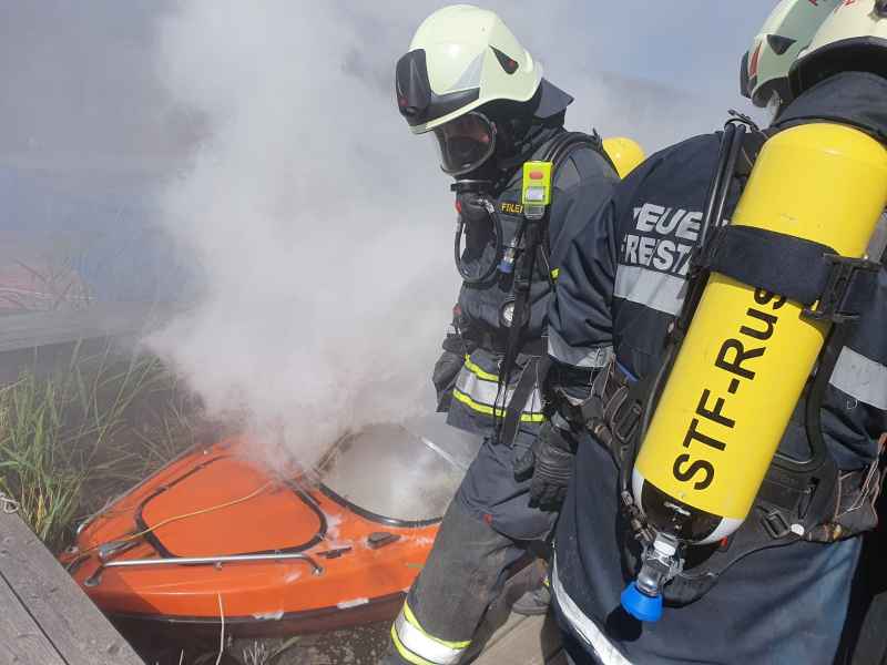 Beim Eintreffen am Einsatzort war eine starke Rauchentwicklung aus dem Bug Bereich eines Elektrobootes sichtbar. Der Erstangriff wurde mittels Handfeuerlöscher durch den ATS- Trupp durchgeführt. Mittels TLF wurde im Bereich der Seestraße angesaugt und eine Angriffsleitung von ca. 150m zum Brandobjekt gelegt. Der Brand wurde soweit eingedämmt um das Elektroboot mittels Zille zum Bootshaus der Feuerwehr Rust zu schleppen. Bei der Slipp Anlage wurde das Elektroboot aus dem Wasser gezogen und mittels Schaum geflutet. Zur Bergung und Abtransport des Elektrobootes wurde die Freiwillige Feuerwehr Rust mit Kran und Abschleppanhänger nachalarmiert. Durch die Feuerwehr Oslip wurde das Elektroboot auf den Abschleppanhänger gehoben und gesichert am Städtischen Bauhof abgestellt. Gegen 19:00 Uhr konnte die Einsatzbereitschaft wiederhergestellt werden.