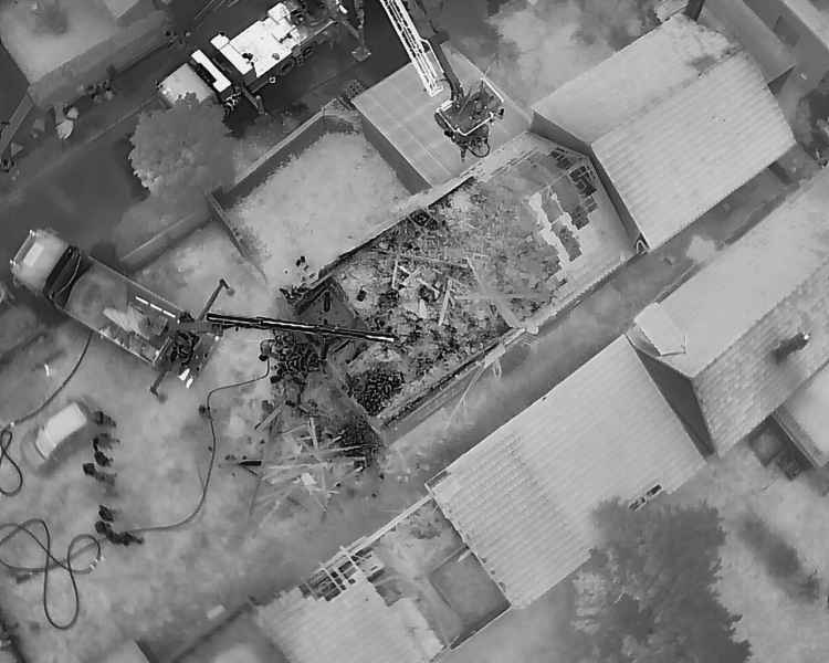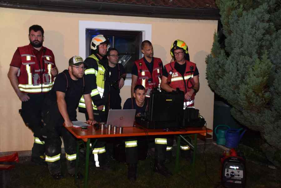 Nach wenigen Minuten rückten fünf Drohnenpiloten mit dem Kommandantenfahrzeug (KDTF) und dem Einsatzleitfahrzeug (ELF) in Richtung Einsatzort aus. Nach kurzer Lagebesprechung mit dem örtlichen Einsatzleiter wurde ein geeigneter Start und Landeplatz gesucht. Nach kurzer Zeit konnten wir bereits dem Einsatzleiter aktuelle Luftaufnahmen liefern. Mithilfe der Wärmebildkamera welche in der Einsatzdrohne verbaut ist, konnten die Glutnester gezielt von der Teleskopmastbühne (TMB) Eisenstadt abgelöscht werden.