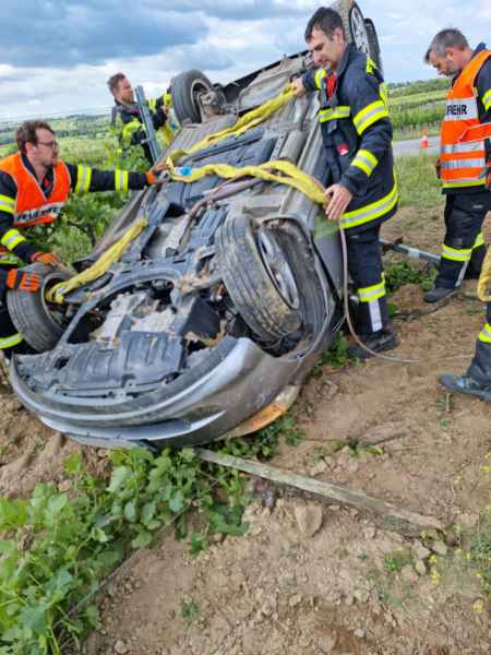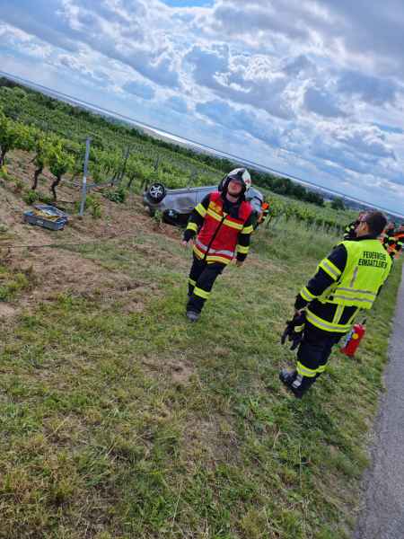 Ein PKW kam aus unbekannter Ursache von der Fahrbahn ab und landete am Dach in einem Weingarten Die Lenkerin konnte selbstständig das Fahrzeug verlassen und blieb zum Glück unverletzt. Die Freiwillige Feuerwehr der Freistadt Rust sicherte die Unfallstelle ab, baute einen Brandschutz auf und klemmte die Fahrzeug Batterie ab, um das Fahrzeug Stromlos zu machen. Nach Rücksprache mit der Exekutive und Besitzerin wurde das Fahrzeug mittels Seilwinde wieder auf die Räder gestellt und gesichert am Fahrbahnrand abgestellt. Um ca. 10:15 Uhr konnte die volle Einsatzbereitschaft wieder hergestellt werden.