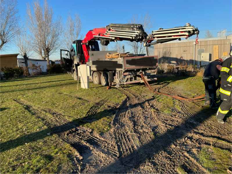 Bei einem Wendemanöver am Campingplatz blieb ein Kran LKW aufgrund des tiefen Bodens mit der linken Seite im Schlammartigen Untergrund stecken. Von der Freiwilligen Feuerwehr Rust wurde der LKW mit Hilfe der Seilwinde aus seiner misslichen Lage befreit.