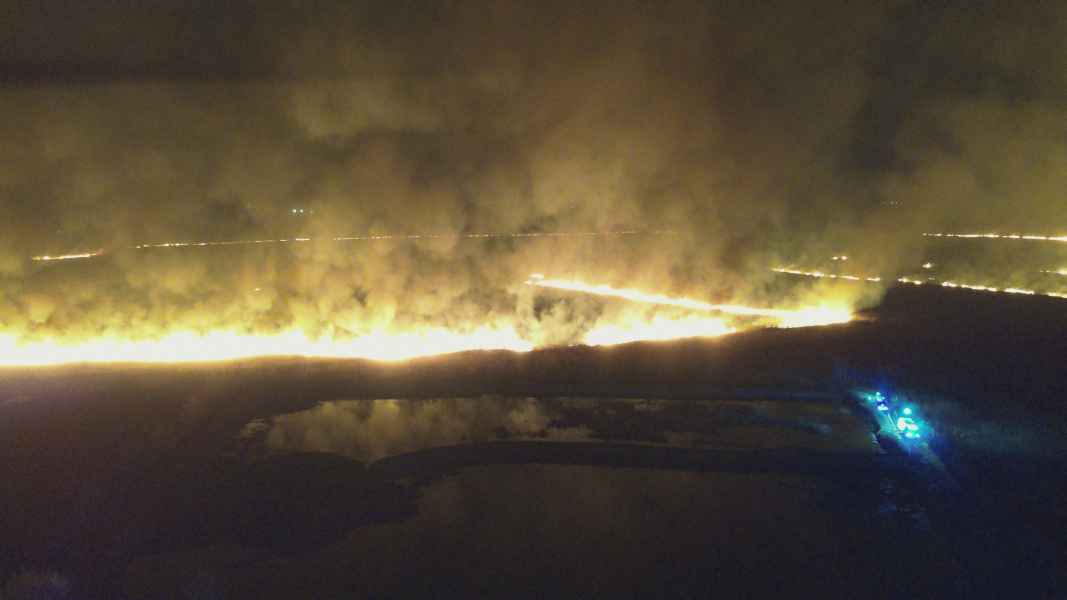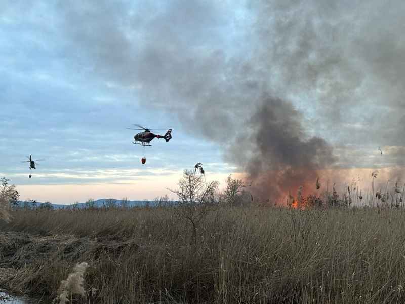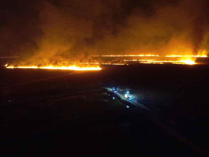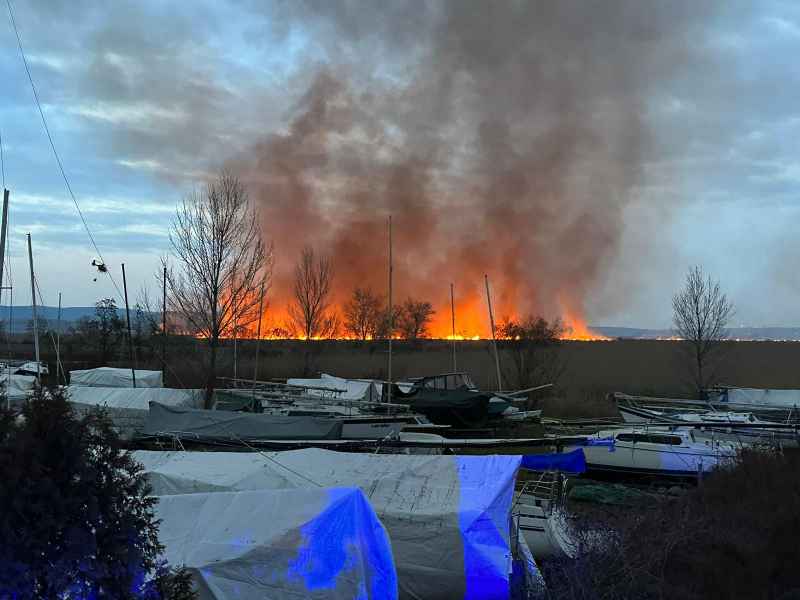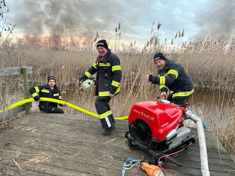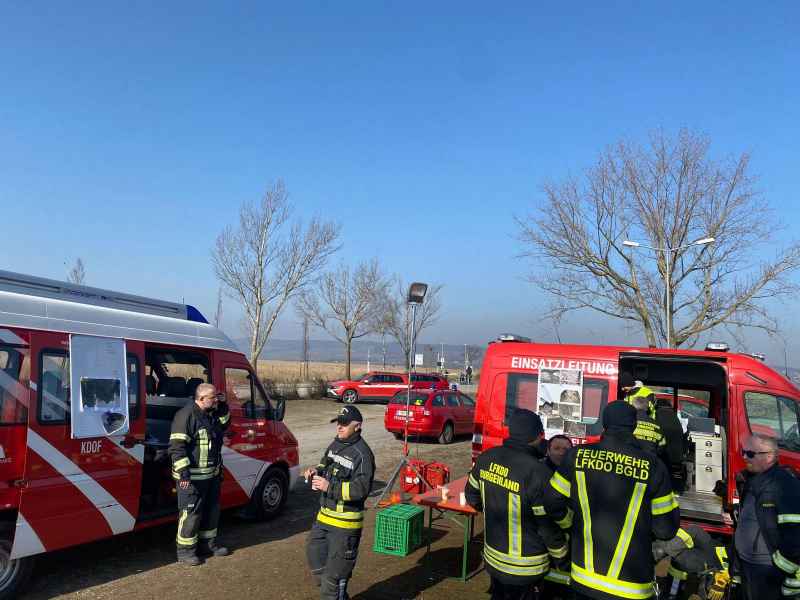 Nach wenigen Minuten rückten unsere Drohnenpiloten mit dem Kommandantenfahrzeug (KDTF) und dem Einsatzleitfahrzeug (ELF) in Richtung Einsatzort aus. Nach kurzer Lagebesprechung mit dem örtlichen Einsatzleiter wurde ein geeigneter Start- und Landeplatz gesucht, sowie alle Freigaben für einen Drohnenflug eingeholt. Gegen 14:30 Uhr konnten die ersten Lagebilder dem Einsatzleiter übermittelt werden. Aufgrund des Windes breitete sich die Flammenfront in Richtung Seebad Breitenbrunn aus, weshalb um 16:20 Uhr mittels Sirene weitere Einsatzkräfte der Freiwilligen Feuerwehr Rust mit Tragkraftspritze nachalarmiert wurden. Kurze Zeit später rückten 12 MitgliederInnen mit unserem Löschfahrzeug mit Bergeausrüstung (LFBA) und Mannschaftstransportfahrzeug (MTF), sowie Einachsanhänger und zwei Tragkraftspritzen in Richtung Breitenbrunn aus. Die Aufgabe der nachalarmierten MitgliederInnen war es mit anderen KameradInnen im Bereich Mobilheimplatz Breitenbrunn eine Riegelstellung aufzubauen, um ein Übergreifen auf den Mobilheimplatz zu verhindern.