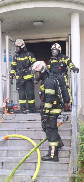 Nach der erfolgreichen Entrauchung des Stiegenhauses wurden alle Personen, die sich noch in ihren Wohnungen befanden, durch den Atemschutztrupp des Löschfahrzeuges mit Bergeausrüstung kontrolliert ins Freie begleitet.